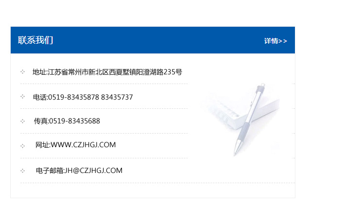 地址:常州市新北區友邦商務大廈1幢16、17層  電話:0519-85101652  傳真:0519-85112595  郵編:213022  網址:www.cz-jiayue_cn.jinshiyulei.com  郵箱:xiajifengaa@163.com